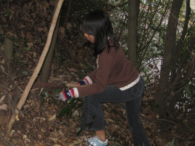 ![]() のこぎりをひくたび 角度が変わるので 細い木もなかなか切 れなかった 三本目くらいから上達 |