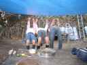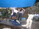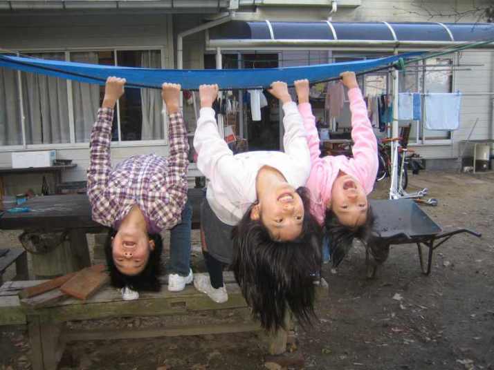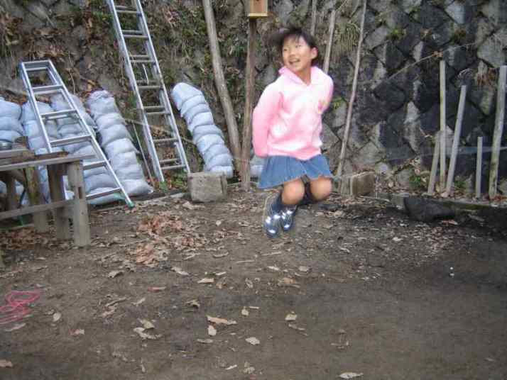 庭でなわとび ロープにつかまってイナバウアー